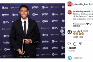 体育资讯4月28日讯 贝林厄姆的弟弟乔布-贝林厄姆更新社媒动态,庆祝获得个人奖项。
